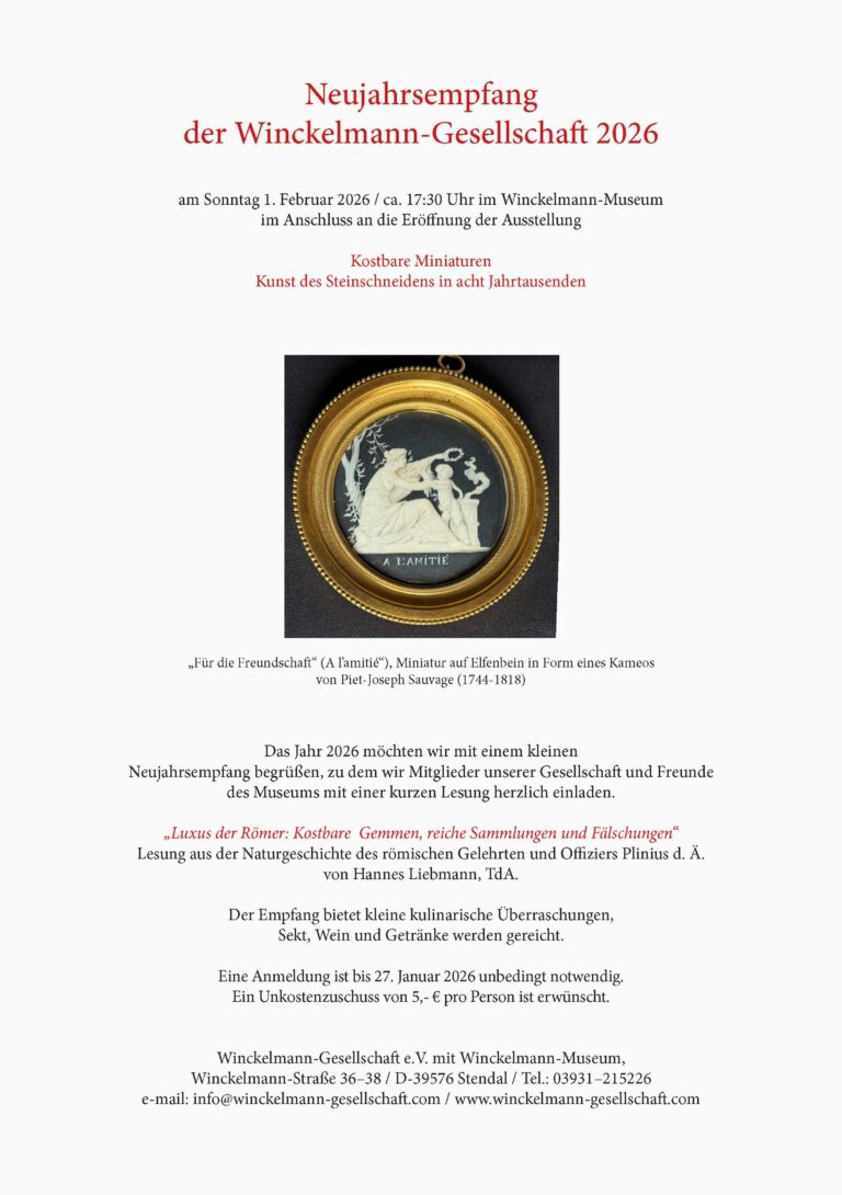 Das Jahr 2026 möchten wir mit einem kleinen Neujahrsempfang begrüßen, zu dem wir die Mitglieder unserer Gesellschaft sowie alle Freunde des Musems mit einer kurzen Lesung herzlich einladen. „Luxus der Römer: Kostbare Gemmen, reiche Sammlungen und Fälschungen“, Lesung von Hannes Liebmann, TdA, aus der Naturgeschichte des römischen Gelehrten und Offiziers Plinius d.Ä. Davor eröffnen wir […]